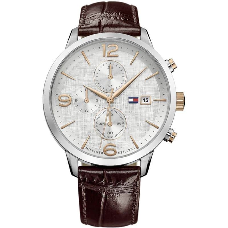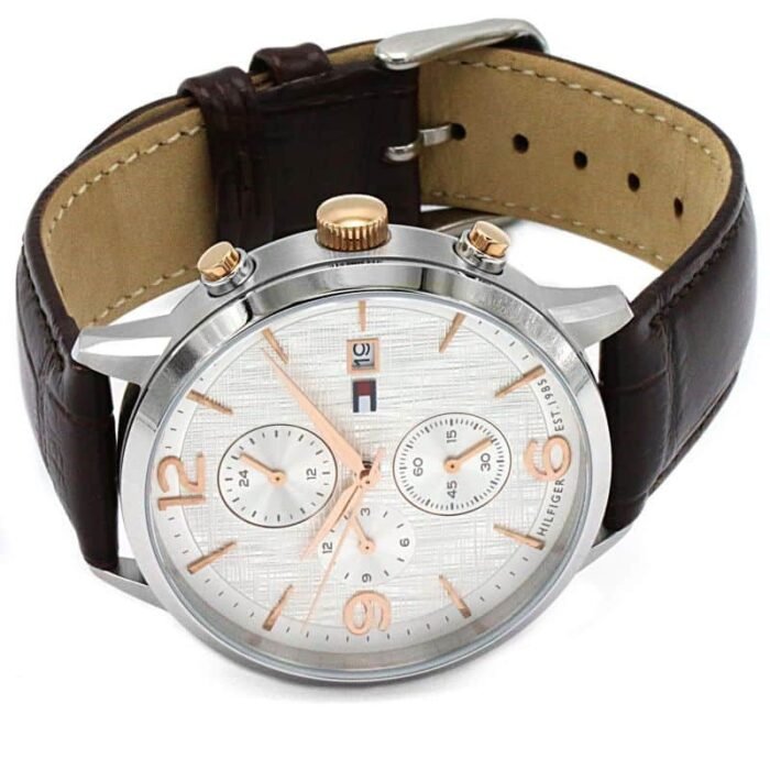 ساعة تومي هيلفيغر للرجال اصلية موديل 1710360 بلون ابيض واستيك جلد لون بني.
