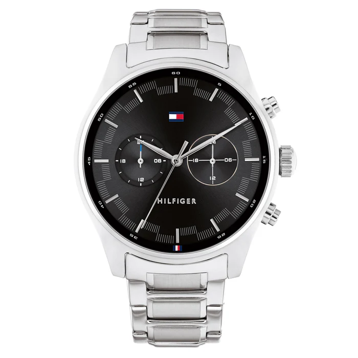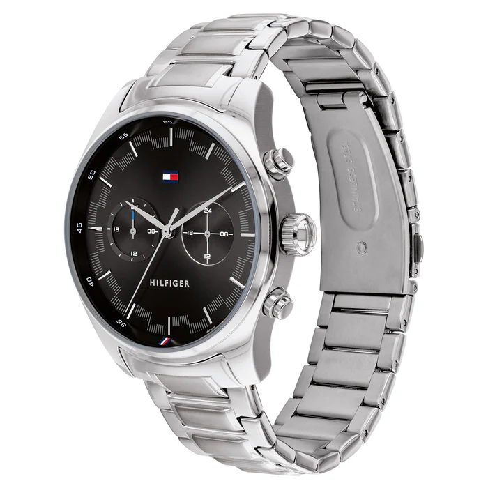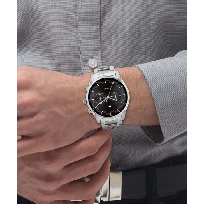 ساعة تومي هيلفيغر Tommy Hilfiger للرجال أصلية موديل 1710419 لون اسود و استيك معدن ستانلس ستيل لون فضي.