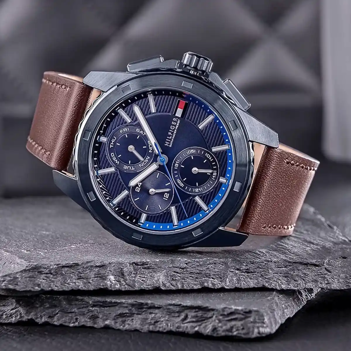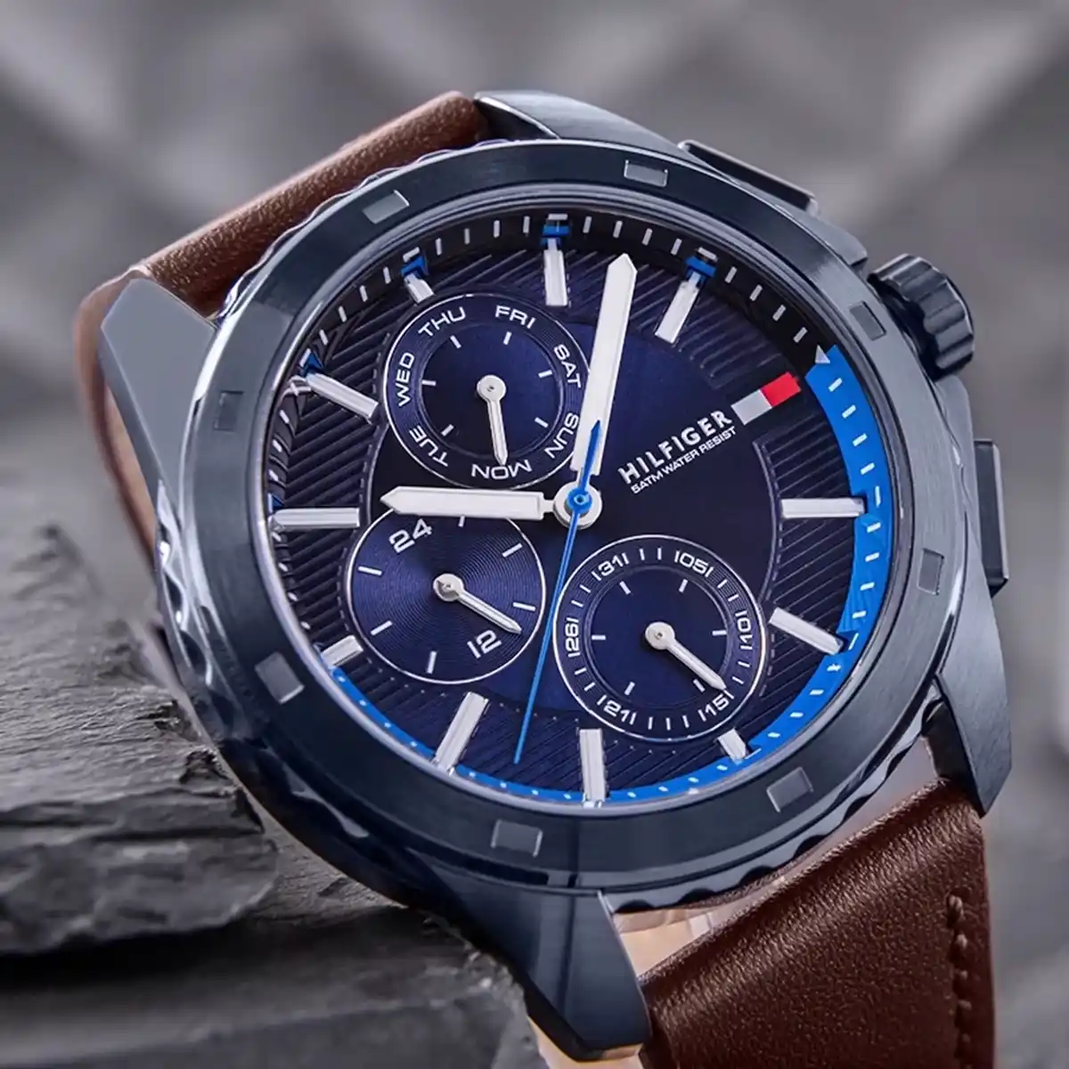 تومي هيلفيغر Tommy Hilfiger للرجال (أصلية) موديل 1710632 لون أزرق و استيك جلد طبيعي لون بني.