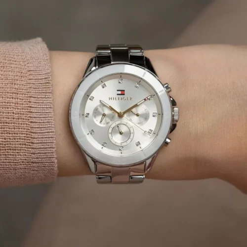 ساعة تومي هيلفيغر Tommy Hilfiger للنساء أصلية موديل 1782707 لون أبيض و استيك معدن ستانلس لون فضي.
