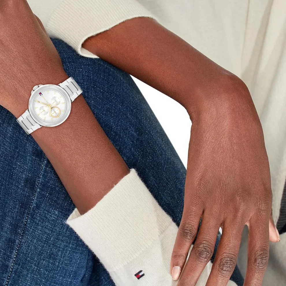 ساعة تومي هيلفيغر Tommy Hilfiger للنساء أصلية موديل 1782753 لون فضي و استيك معدن ستانلس ستيل لون فضي.