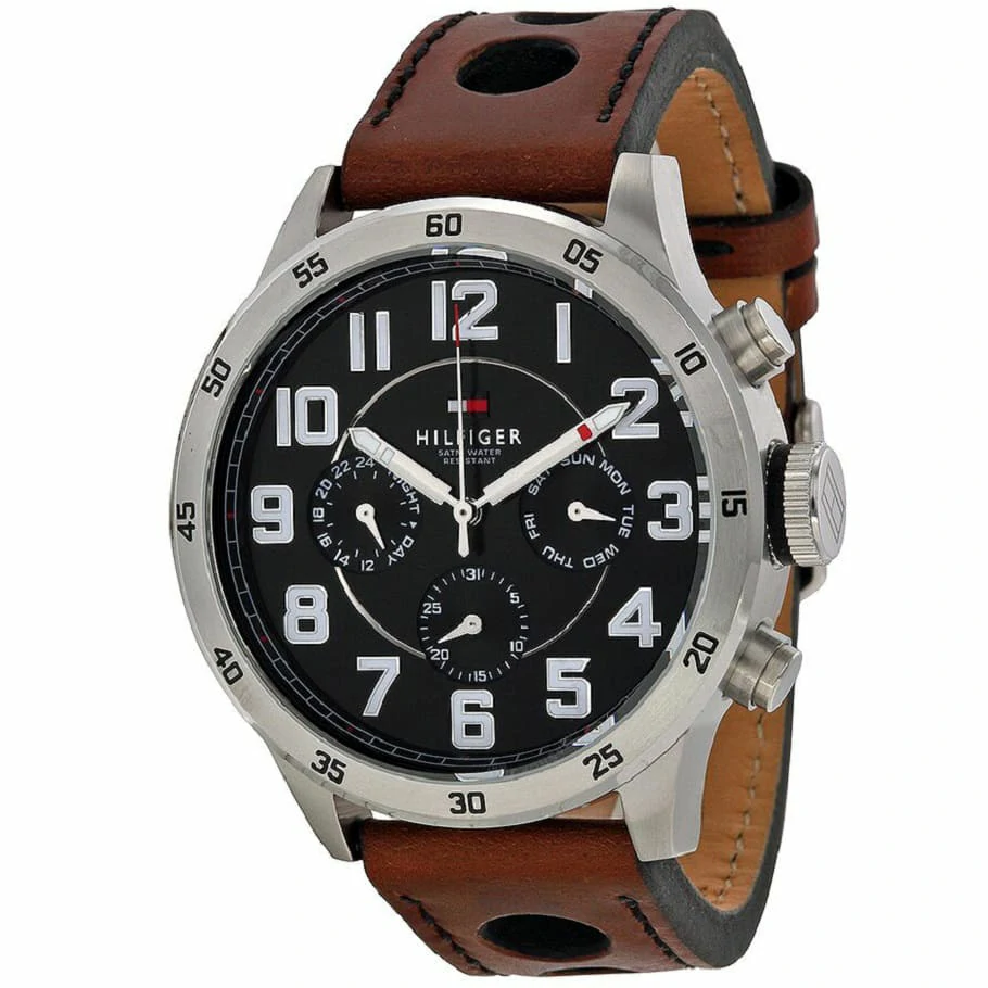 ساعة تومي هيلفيغر للرجال اصلية موديل (ترينت) Trent 1791049 لون اسود واستيك جلد طبيعي لون بني.