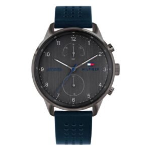 ساعة تومي هيلفيغر للرجال أصلية 1791578 لون رمادي و استيك جلد طبيعي لون ازرق.