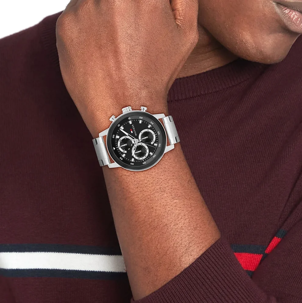ساعة تومي هيلفيغر Tommy Hilfiger للرجال أصلية موديل 1792181 Rocky لون أسود و استيك معدن ستانلس ستيل لون فضي.