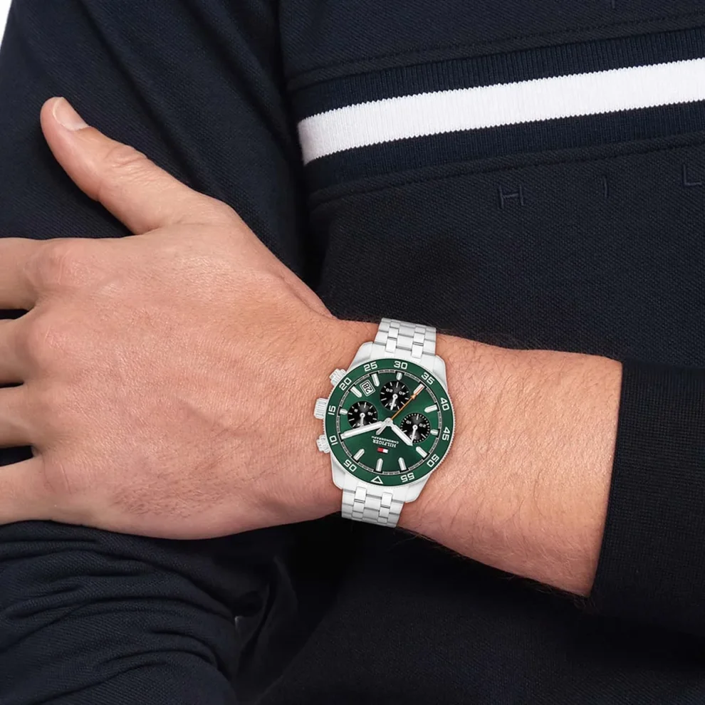 ساعة تومي هيلفيغر Tommy Hilfiger للرجال أصلية موديل ( Th85 ) 1792214 Th85 لون اخضر و استيك معدن ستانلس ستيل لون فضي.