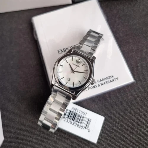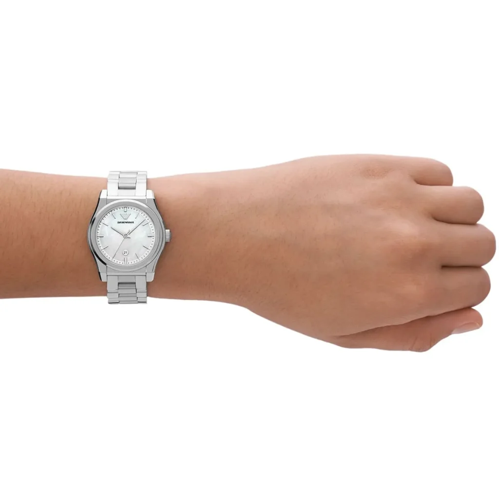 ساعة إمبوريو أرماني Emporio Armani للنساء أصلية AR11557 لون أبيض و استيك معدن ستانلس لون فضي